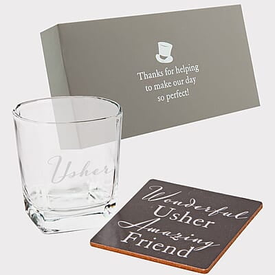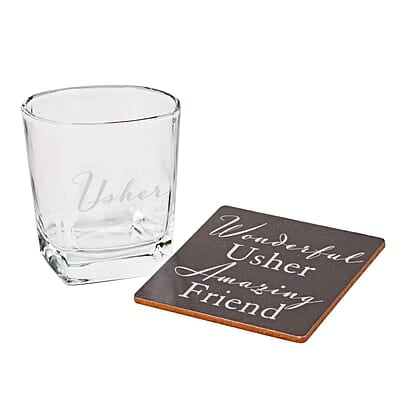 Express your gratitude to a special usher with this distinctive glass and coaster set. The glass, etched with the word 'Usher,' and the coaster, inscribed with 'wonderful usher, amazing friend' in silver foil, make for a thoughtful and personalized memento.