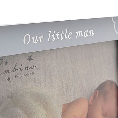 Capture the joy of your new-born son's arrival with this exquisite landscape frame. Boasting a matt blue wooden finish and rectangular aperture, it is enhanced by silver detailing and the affectionate sentiment, 'Our Little Man'.