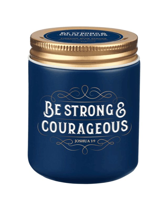 Be Strong and Courageous Fireside Blue Spruce Scented Candle with Screw Top Lid