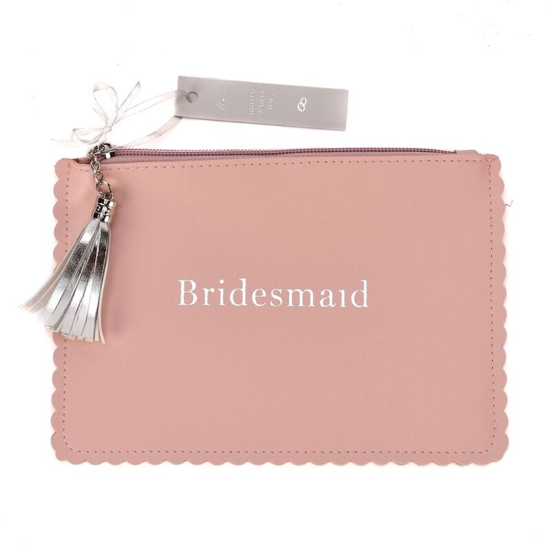 Keep your bridesmaid squad looking chic and organised with this beautiful pink and silver clutch bag. Crafted from Pink PU, it's the perfect size for all their wedding day essentials. The bag features a stylish silver 'Bridesmaid' title and a fashionable silver tassel on the zip, adding an extra dash of elegance.