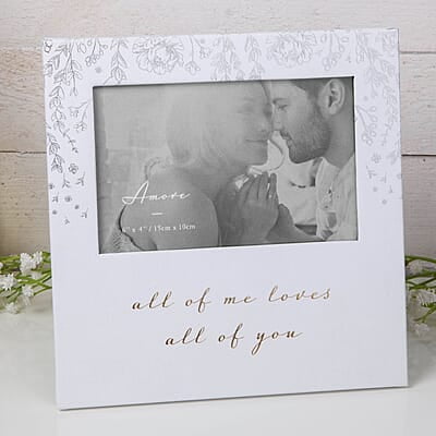 With a heartfelt gold foil embossed 'ALL OF ME LOVES ALL OF YOU' title, it perfectly encapsulates the depth of your affection. Designed to hold a 6" x 4" landscape photo and equipped with a standing strut, this frame is a thoughtful keepsake for your partner or a testament to a strong couple in your life. Presented in a branded gift box, it perfectly embodies love and devotion.