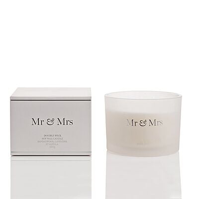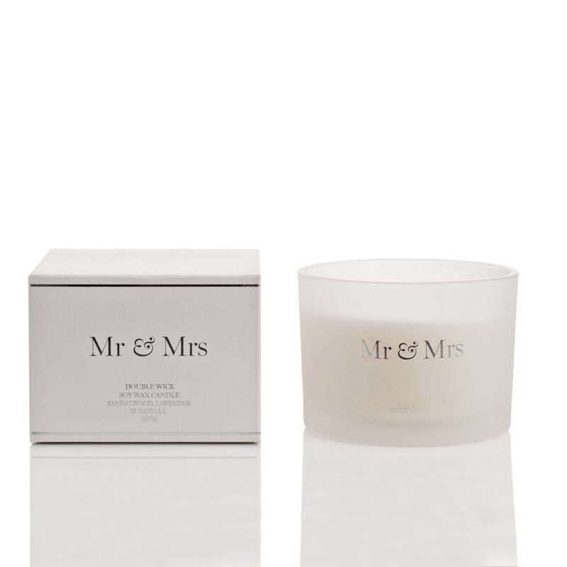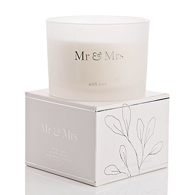 Illuminate the newlyweds' home with love and warmth using this elegant 'Mr & Mrs' candle. Crafted from a soy wax blend, this candle not only guarantees a longer burn time but also maintains an unburnt appearance, making it a perfect home accessory.