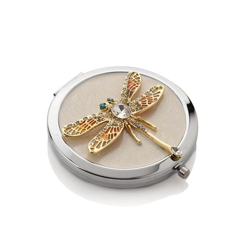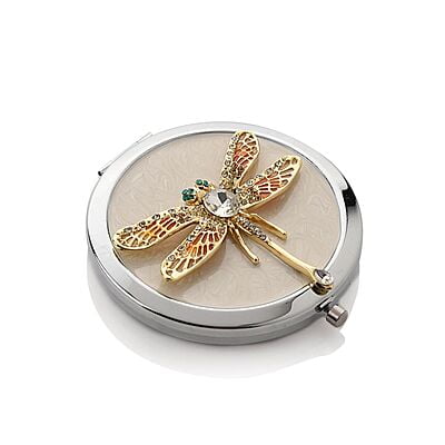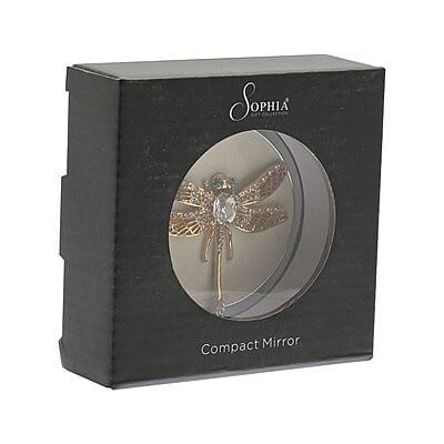 Infuse some sparkle into your daily routine with this dragonfly compact mirror. The perfect blend of style and glitz features a striking yellow and gold design that's sure to catch the eye. Presented in a sleek Sophia black gift box, this mirror makes an excellent gift for your loved ones who appreciate a bit of glamour in their accessories.